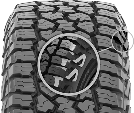 숄더 스쿱 트레드 엣지, 넓은 트레드 홈, 사이드월 후크 패턴 등 강화된 숄더 설계 요소는 타이어 수명 전반에 걸쳐 지속적인 접지력과 견인 성능을 유지하도록 돕습니다.